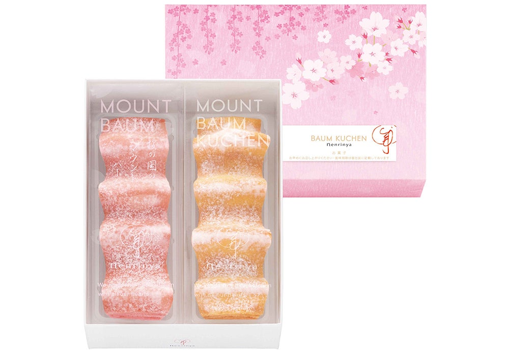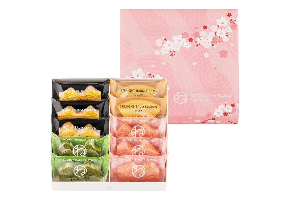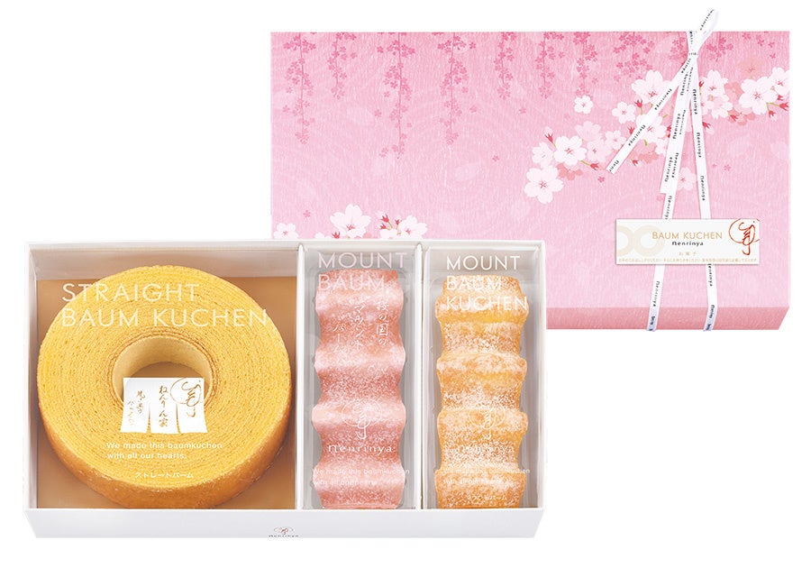 ねんりん家、春の詰合せ。濃厚なバター香る代表作「マウントバーム しっかり芽」。ほのかに桜香る春限定「桜の国のマウントバーム」。ふっくらジューシーな「ストレートバーム やわらか芽」。