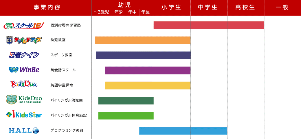 株式会社やる気スイッチグループは、個別指導塾「スクールIE®」や知能育成(知育)と受験対策の幼児教室「チャイルド・アイズ®」、子ども向け英語・英会話スクール「WinBe®(ウィンビー)」、英語で預かる学童保育「Kids Duo®(キッズデュオ)」、幼児・小学生向けスポーツ教室「忍者ナイン®」、バイリンガル幼児園「Kids Duo International®(キッズデュオインターナショナル/略称:KDI)」「i Kids Star®(アイキッズスター)」、「プログラミング教育 HALLO®」の8つのスクールブランドを展開する総合教育サービス会社として、現在国内外でおよそ2,300以上※1の教室を展開し、13万人以上※2の子どもたちの学びをサポートしています。