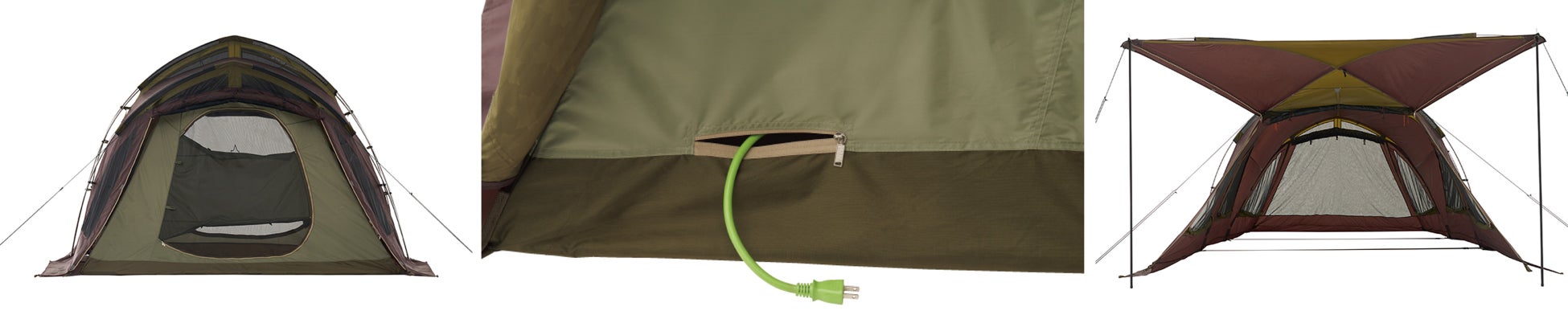 インナーテントには、上下にベンチレーションを備えたC型ドアを採用。さらに、ジッパー付きの電源コードの取り込み口を設置しており、冷気をしっかり遮断しながら電源コードの使用が可能。インナーテントを外すと、フライシート単体でもスクリーンタープとして使用可能で、真夏日や雨天時のキャンプでも活躍。