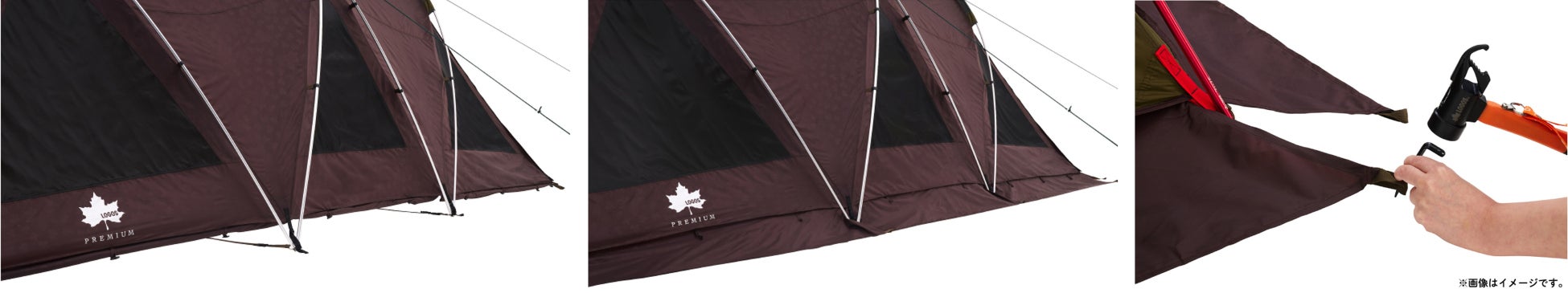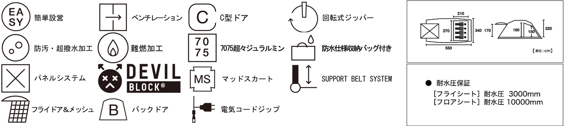 インナーテントには通気性を向上するC型ドアや、ジッパー付きの電源コードの取り込み口を設置しており、マッドスカートは、AIR VENT SKIRT SYSTEMにより昇降式となっており、テント内の通気性がさらにUPしています。