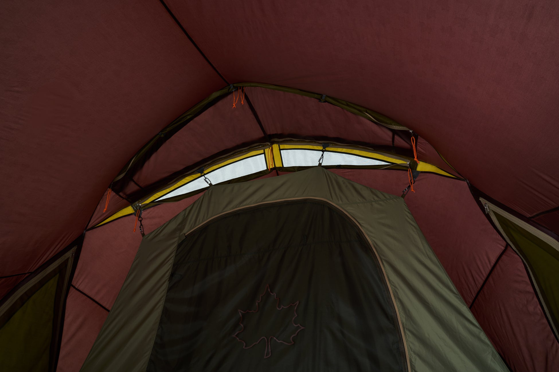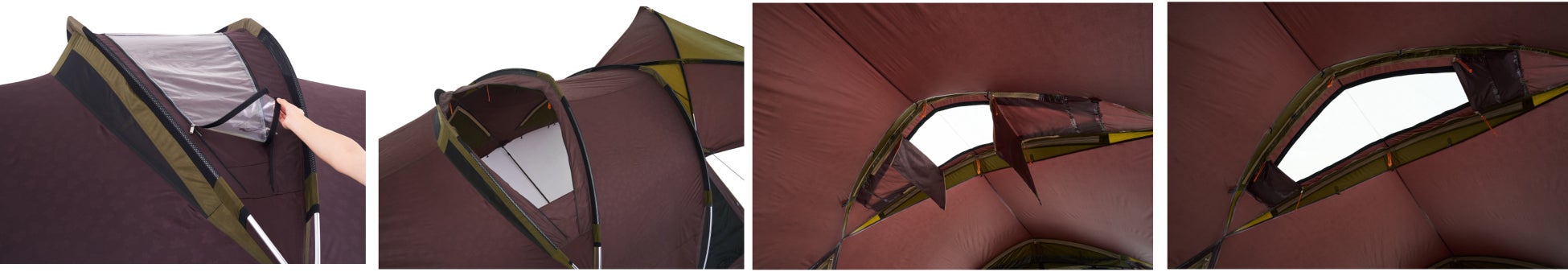 どんぐりの英名(=エーコン)を冠した新開発のエーコンフレームは、どんぐりのように尖った形状によって壁面の押し上げ効果をもたらし、高い天井と広い空間による抜群の居住性と耐風性を実現しました。エーコンフレームの尖った部分によってできる天井部のAIR INLET ROOFは、立ち上がりのあるベンチレーションを作り効率的に風を取り込むことができるため、空気循環機能を大幅に向上させ温度調節も容易となりました。中央の天井部分にクリアな天窓を配置しているため、室内が明るくなり、星空観察をはじめ外の景色も楽しめます。天窓は開閉できるので、天候や気候に合わせてカスタマイズが可能です。