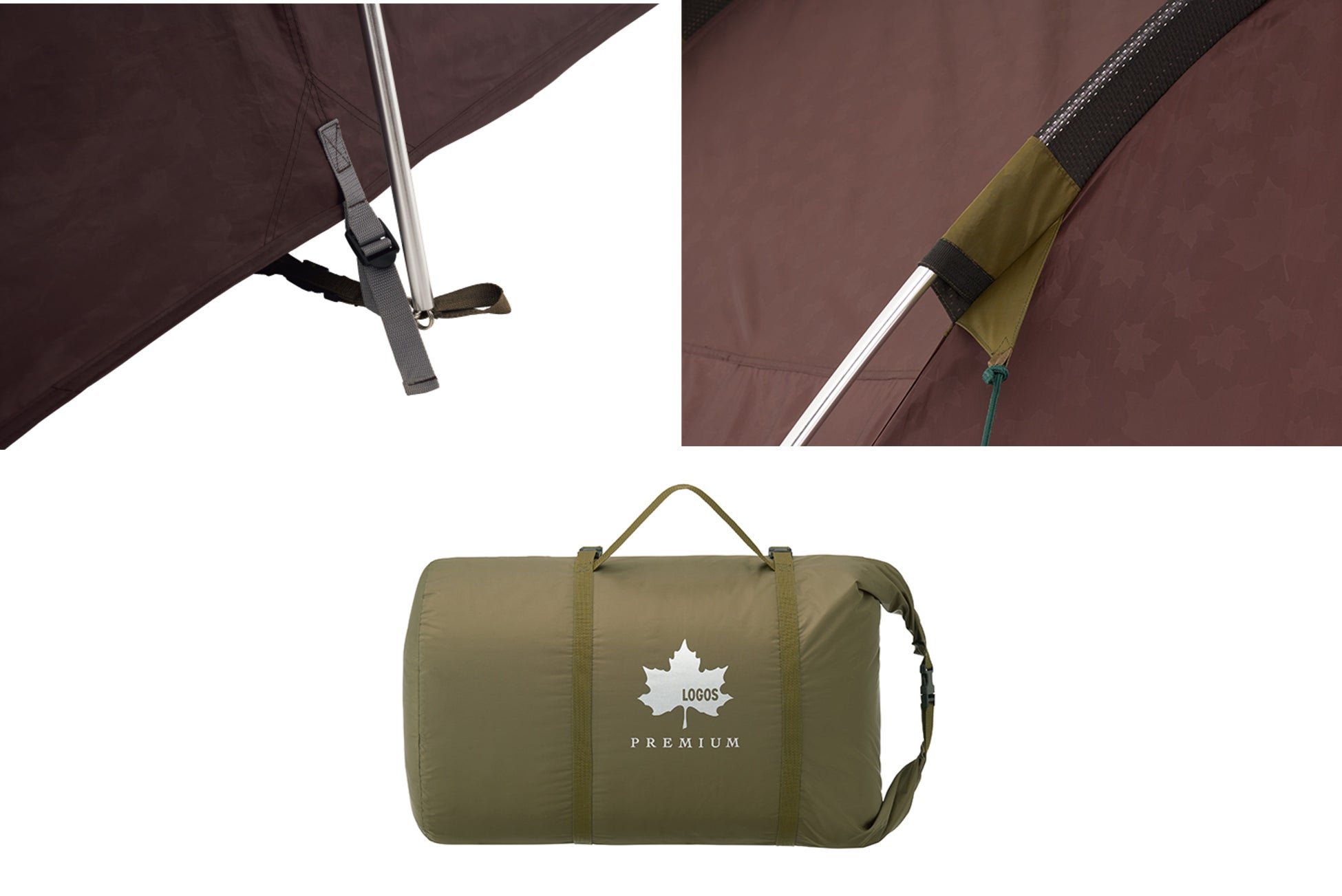 設営を簡単サポートするSUPPORT BELT SYSTEMを採用しており、フレームをセット後に伸ばしたベルトを短く締めるだけで余分な力を使わずに簡単に設営できる。撤収時は汚れや水からアイテムを守る防水仕様の収納バッグ付きで、濡れたフライシートを入れても安心して持ち運ぶことが可能。