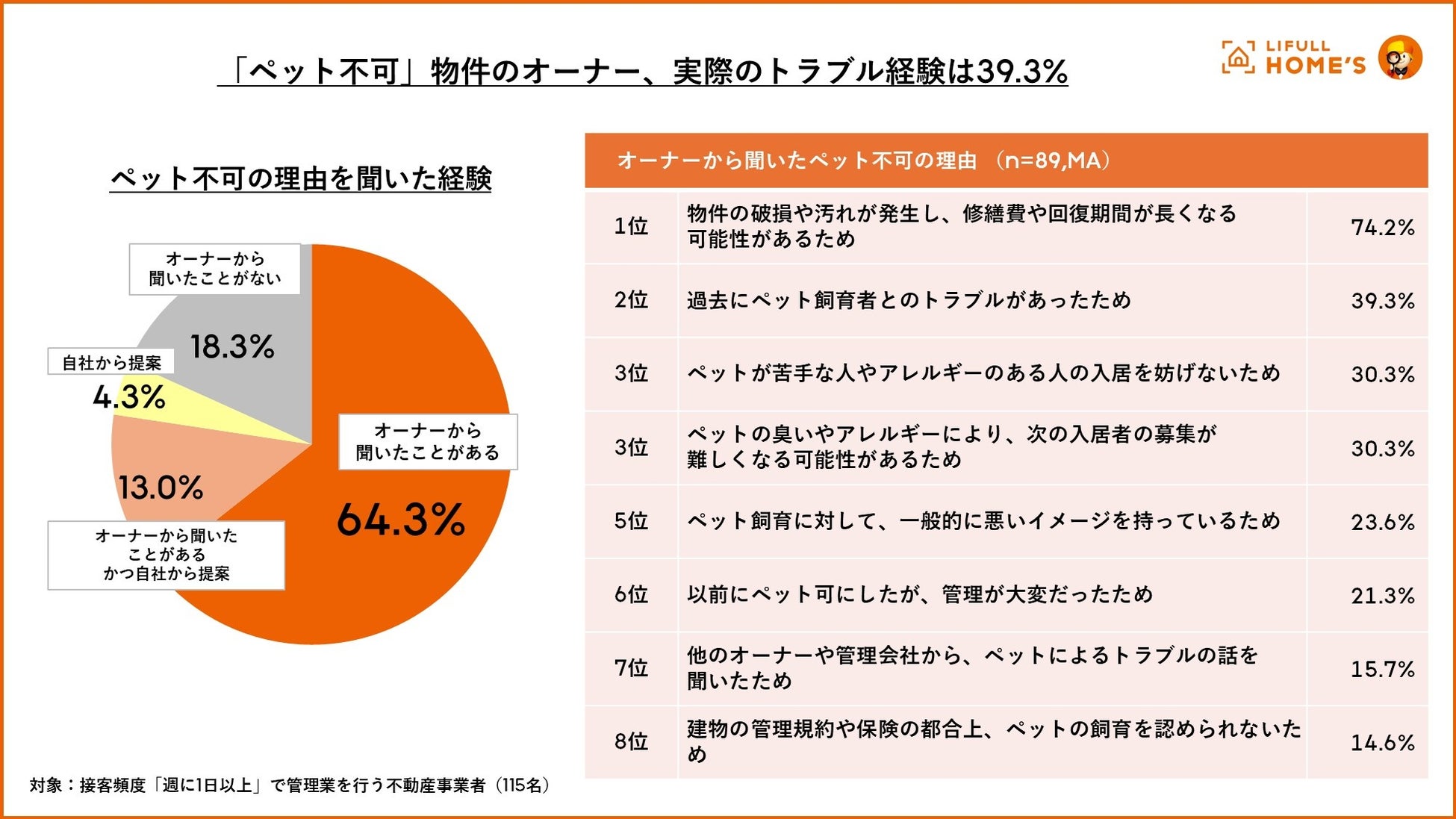 ペット不可の理由をオーナーから聞いた経験がある不動産会社77.3%に対し、「自社から提案」(「自社から提案」「オーナーから聞いたことがあるかつ自社からの提案」)と回答したのは17.3%ほどだったことから物件のペット可/不可はオーナーの判断による部分が大きいようです。