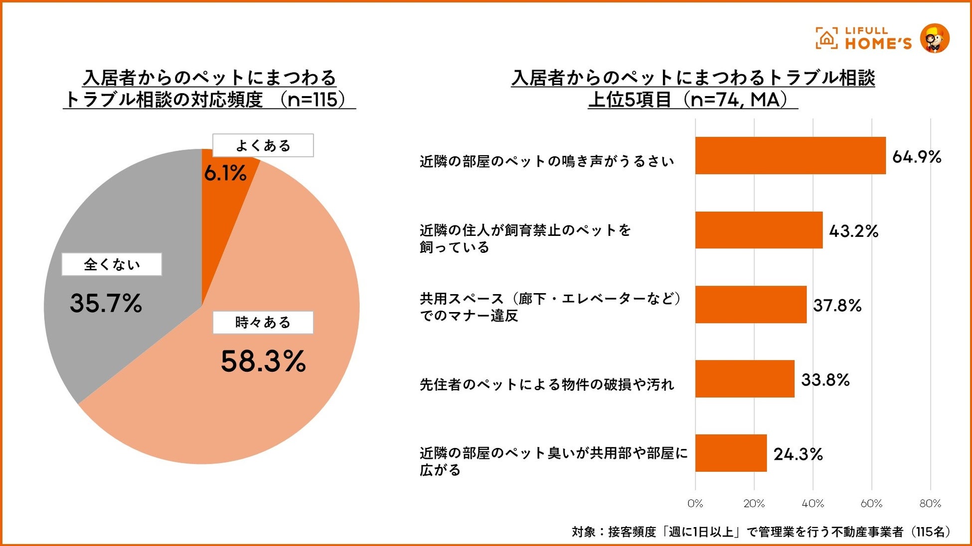 一方で、居住者からのペットにまつわるトラブル相談の対応頻度は「よくある」が6.1%、「時々ある」が58.3%、「全くない」が35.7%と不動産事業者の約6割がトラブル相談に対応しているようです。