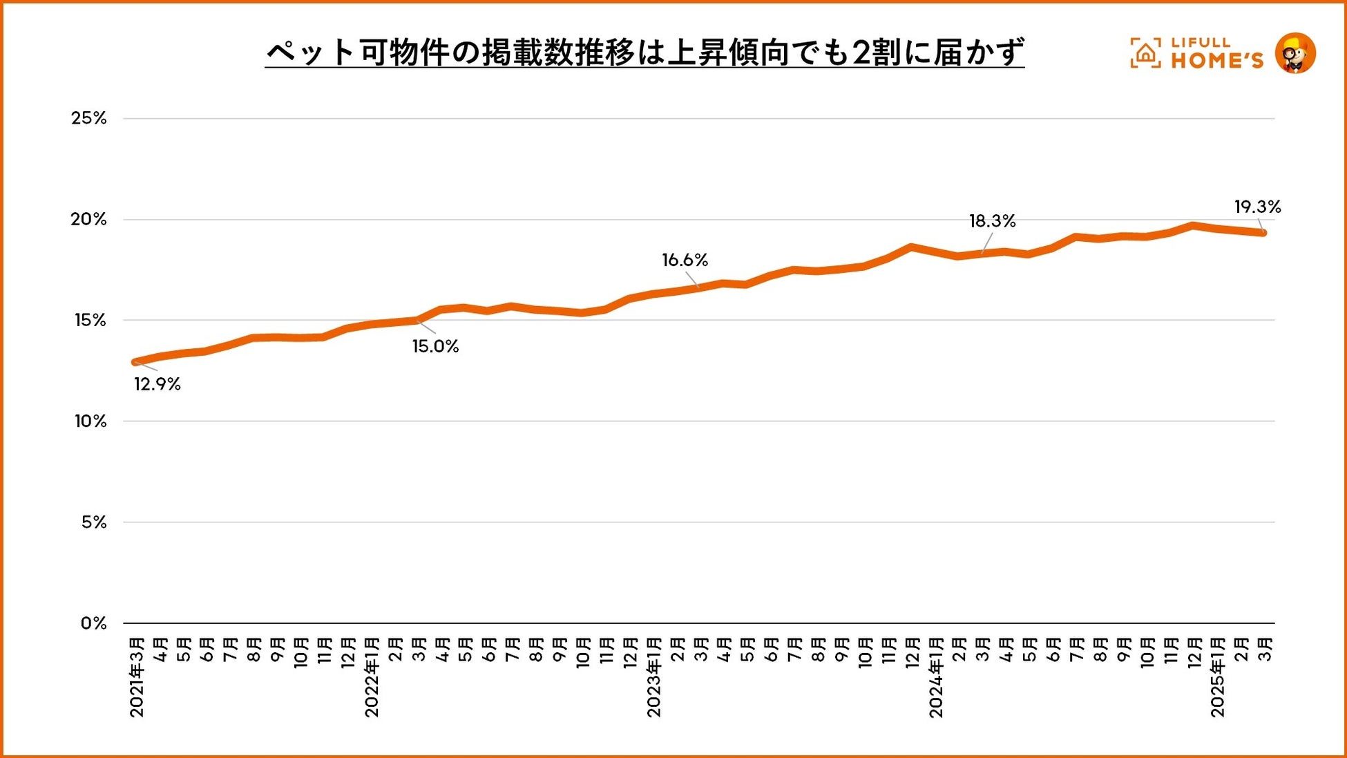 まず、LIFULL HOME'Sにおける「ペット可」物件の掲載割合を調べました。2022年3月は賃貸物件の12.9%、2025年3月時点では19.3%と4年間で6.4ポイント上昇しましたが全体の2割にも届いていません。ペット飼育割合が28.6%(クロス・マーケティング「ペットに関する調査(2024年)」)とすると、十分な供給量とはいえない状況です。