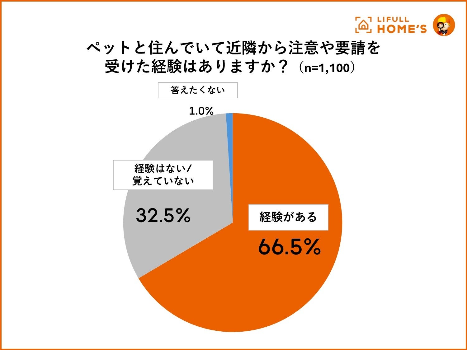 ペットと一緒に住んだ後についても聞いたところ、近隣から注意や要請を受けた「経験がある」と回答した人は66.5%と高い結果となりました。
