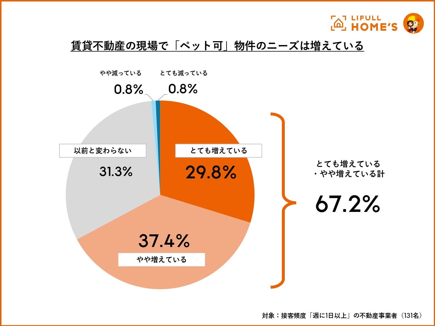 まず、ここ2,3年での「ペット可」物件のニーズについて聞いたところ、全体の67.2%が「増えている」と回答しました。