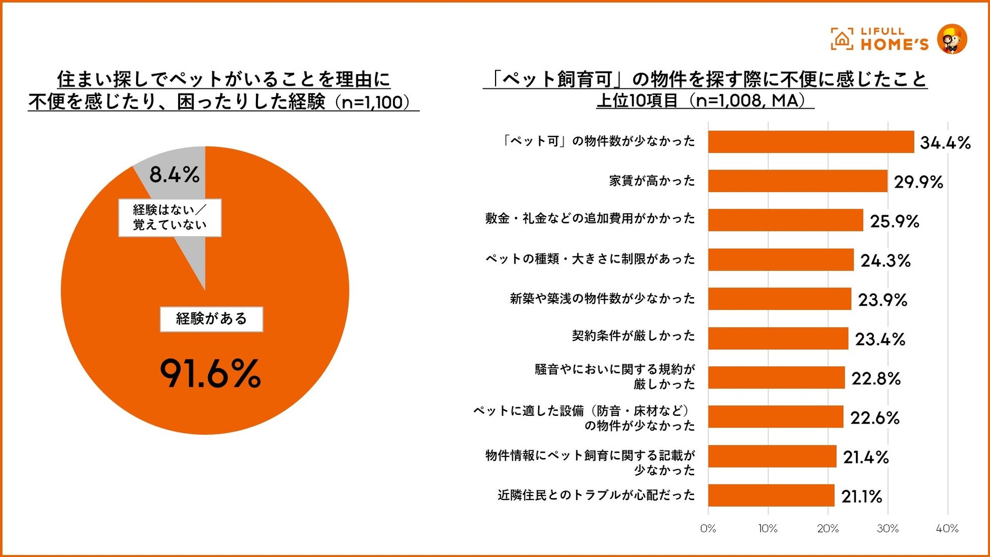 ペットとの住まい探しの経験がある人に、住まい探しでペットがいることを理由に不便を感じたり、困ったりした経験について聞いたところ、91.6%が「経験がある」と回答しました。不便だった理由1位は「ペット可物件の数の少なさ」(34.4%)でした。LIFULL HOME'Sの掲載データでも全体の2割以下であることから、立地や条件を絞るとさらに物件の数が少なくなることは想像に難くありません。この他には、「家賃や敷金の追加費用」など金銭面の負担が挙がりました。また、「ペットの種類・大きさの制限」や「契約条件や規約が厳しい」などの回答もあり、気に入った物件への入居までには様々なハードルを越えていかなければならないようです。