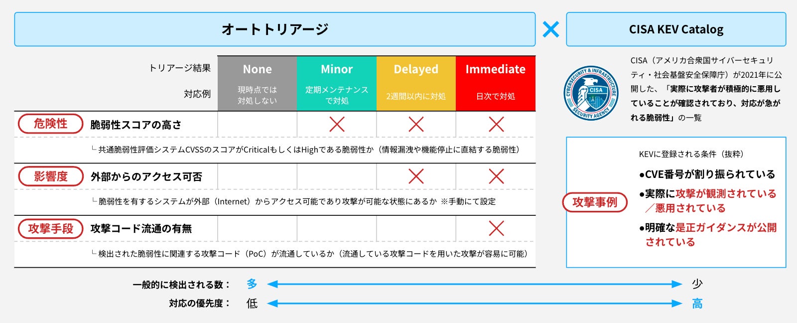 すべての脆弱性に対応することは不可能であり、CISA KEVやPoC等の脅威情報を組み合わせることで実際にリスクの高い脆弱性に絞り込み、優先順位をつけて脆弱性対応を行う必要があります。