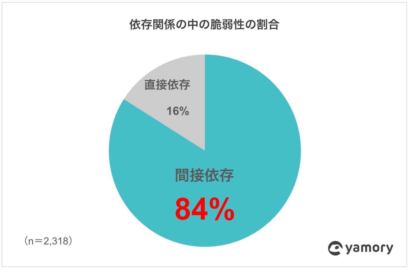 1つソフトウェアを導入するとそのソフトウェアが依存する他のソフトウェアも一緒に導入されるため、OSS利用が一般化している昨今はソフトウェアの依存関係が複雑化しています。yamoryで2024年に検知された「Immediate」の脆弱性(2,318件)のうち、84%が間接的に導入されたソフトウェアの脆弱性であり、間接依存を含めた正確なソフトウェア管理ができていないと、脆弱性の脅威に晒されることになります。