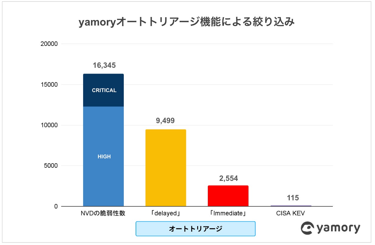 yamoryでは、独自で構築した脆弱性のデータベースを使い、危険度のレベルを算出し、対応の優先度を自動で判断するオートトリアージ機能(特許番号:6678798号)を提供しています。オートトリアージ機能により即日対応が必要とされる「Immediate」に分類された脆弱性は、NVDで公開されている「High」「Critical」の脆弱性16,345件から、84.4%減の2,554件に絞られました。そのうちCISA KEVカタログ(※)に掲載され、既に悪用が観測されている脆弱性は4.5%(115件)でした。