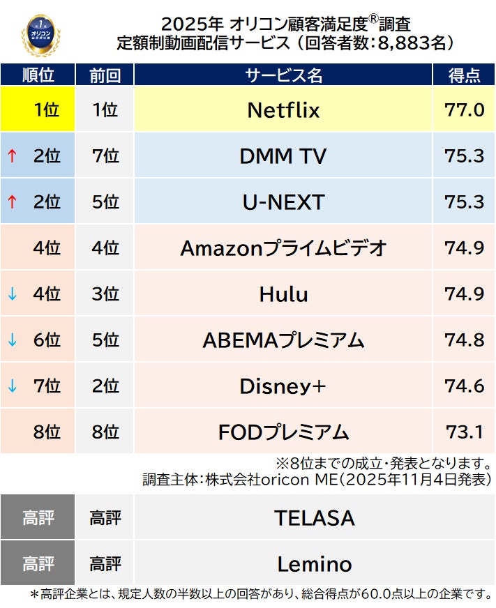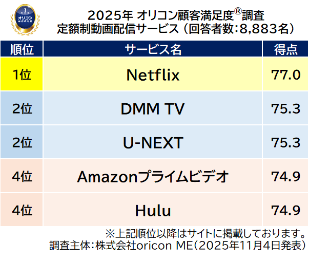 2025年 満足度の高い『定額制動画配信サービス』ランキング |【Netflix】が3年連続7度目の総合1位|国内勢の【U-NEXT】と【DMM TV】が同点で総合2位に浮上(オリコン顧客満足度調査)