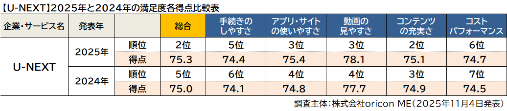 【U-NEXT】が前回総合5位⇒総合2位に浮上 “コンテンツの充実さ”で高評価