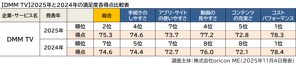 【DMM TV】が総合7位⇒総合2位に上昇 「コストパフォーマンス」で2年連続1位に