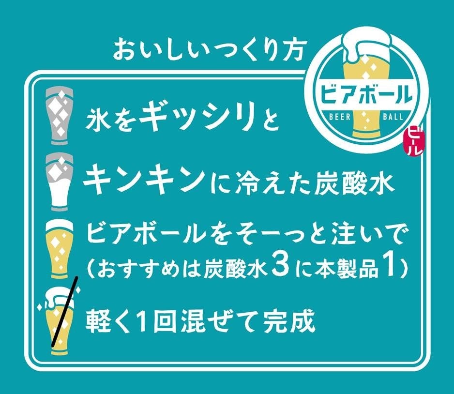 炭酸水と「ビアボール」の割合3:1がおすすめですが、好きな濃さでお楽しみいただけます。炭酸水を入れずに氷と「ビアボール」でつくるビアロックもお試しください。