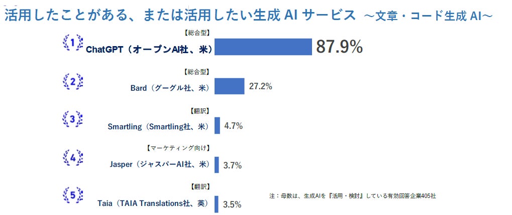 このうちChatGPTの登場で特に注目されている『文章・コード生成AI』を具体的にみると、「ChatGPT」(オープンAI社、米)が87.9%で最も高かった。次いで、「Bard」(グーグル社、米)が27.2%、「Smartling」(Smartling社、米)が4.7%で続き、ChatGPTが他の生成AIより突出して高くなった。
