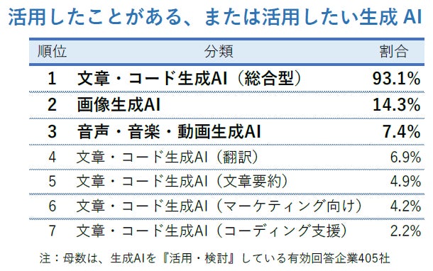 生成AIを『活用・検討』している企業に、活用したことがある、または活用したい生成AIについて尋ねたところ(任意・複数回答)、ChatGPTなどを含む『文章・コード生成AI(総合型)』が93.1%で最も高かった。次いで、『画像生成AI』(14.3%)、『音声・音楽・動画生成AI』(7.4%)が続いた。