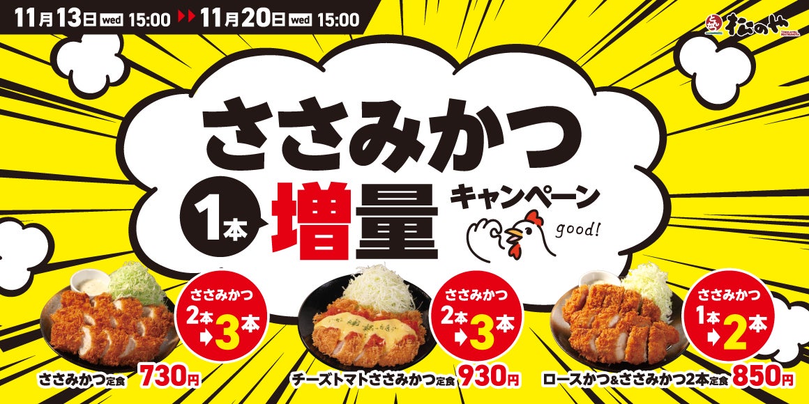 株式会社松屋フーズ(本社:東京都武蔵野市、代表取締役社長:瓦葺 一利)では、とんかつ専門店の「松のや」におきまして、2024年11月13日(水)午後3時より、「ささみかつ1本増量キャンペーン」を開催いたします。