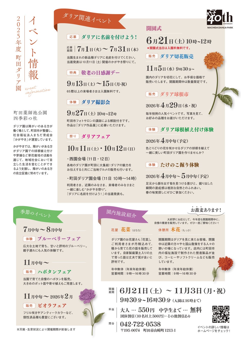 開園期間中は、例年のブルーベリーの摘み取り体験や「ダリアに名前を付けよう!」などのイベントの他にも、開園40周年記念イベントとして、「ダリアフェア」を町田薬師池公園四季彩の杜 西園にて実施します。「ダリアフェア」では、各地のダリア園で育てたダリアを展示してダリアの魅力を発信するとともに、各地のご当地グルメを販売予定です。