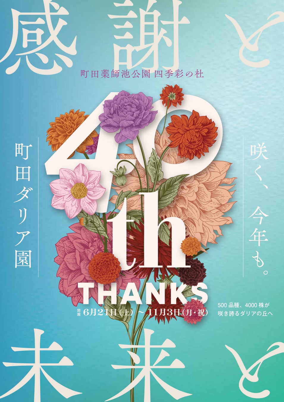 6月21日から11月3日まで、今年で開園40周年を迎える「町田薬師池公園四季彩の杜 ダリア園」が開園します。本園は、関東以西で最大級のダリア園で、約1万5,000㎡の園内には約500品種・4,000株の様々なダリアが咲き競います。ダリア独特の花色である二色咲き、絞り咲き、ブレンド(ぼかし)など美しさを楽しむ品種や、花径30センチを超える巨大輪から3センチほどのポンポン咲き品種までを一堂に集めています。
