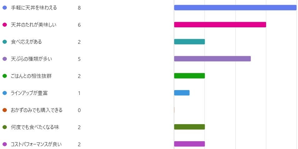 最も多くの票を集めたのは『手軽に天丼を味わえる』というポイントでした。以下2位は『天丼のたれが美味しい』、『天ぷらの種類が多い』でした。