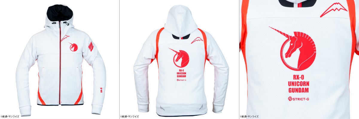 KUSHITANIが独自に開発したダイヤ状の凹凸感のある肉厚な綿タッチの素材を使用。 裏面も凹凸を設け、肌あたりの面積を少なくすることでより良い着心地に貢献します。人気のフードデザインで、『機動戦士ガンダム』よりシャアをイメージしたカラーリングで左袖を配色にしてスポーティさを向上させたブラック、『機動戦士ガンダムUC』よりユニコーンガンダムのサイコフレームをイメージしたカラーリングのホワイトの2種展開。