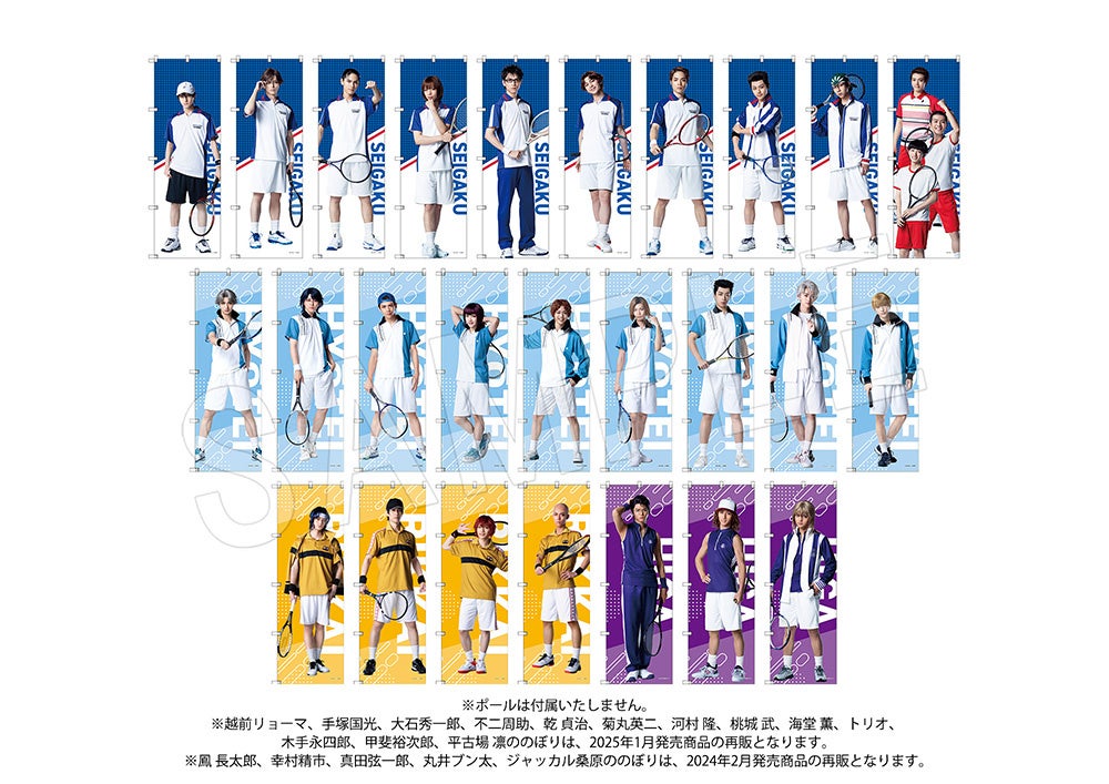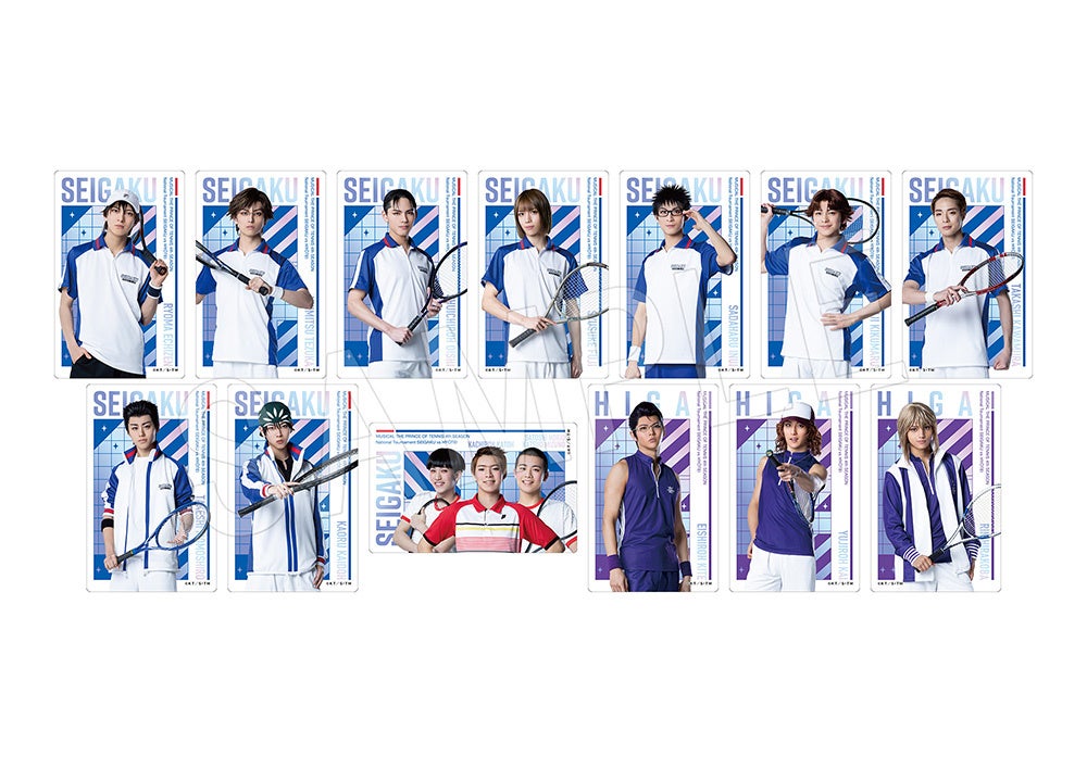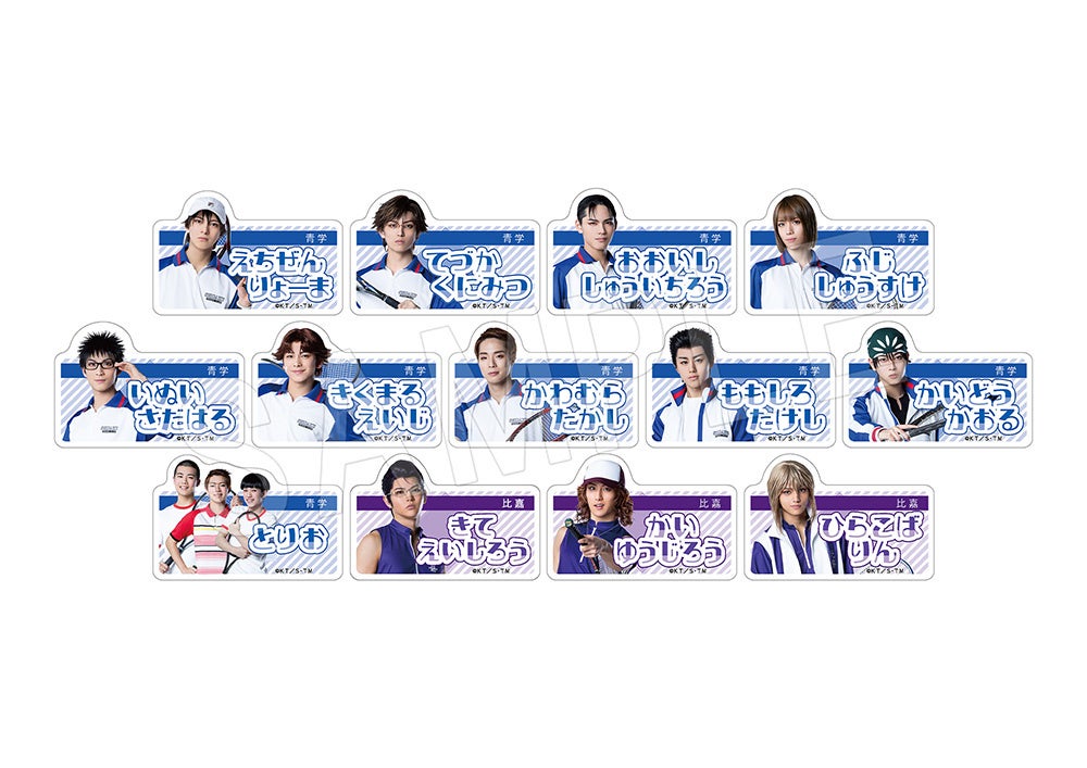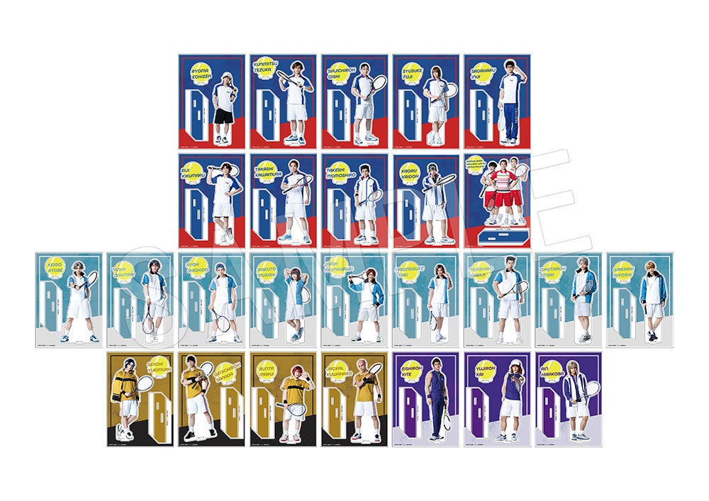 ラインナップ:越前リョーマ、手塚国光、大石秀一郎、不二周助、乾 貞治、菊丸英二、河村 隆、桃城 武、海堂 薫、トリオ、跡部 景吾、忍足 侑士、宍戸 亮、向日 岳人、芥川 慈郎、滝 萩之介、樺地 崇弘、鳳 長太郎、日吉 若、幸村 精市、真田 弦一郎、丸井 ブン太、ジャッカル 桑原、木手 永四郎、甲斐 裕次郎、平古場 凛(全26種)