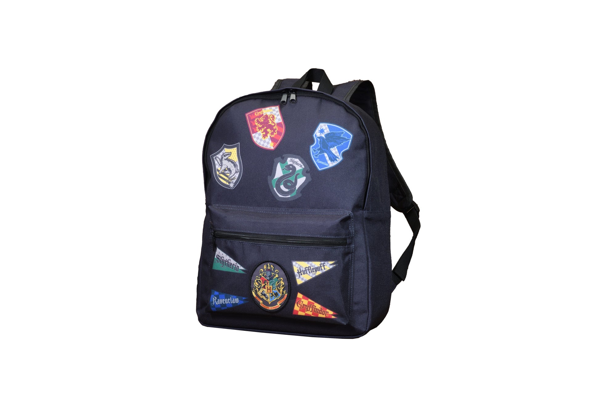 『ハリー・ポッター』のホグワーツ4寮すべての寮章と、各寮のフラッグ、そしてホグワーツ魔法魔術学校の校章が入った豪華なデザインのリュック。
