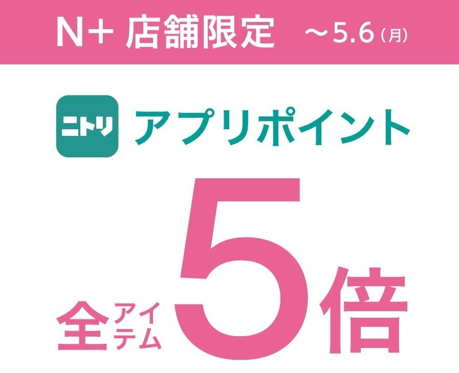 社⻑:⾼橋陵)は、すべてのN+ 全国41店舗を対象とした "ニトリアプリ会員限定 ポイント5倍キャンペーン" を開催いたします。2024年4⽉26⽇(金)〜5⽉6⽇(月)の11⽇間のキャンペーンです。