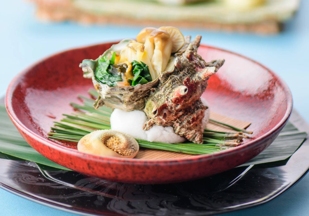 香ばしく焼き上げた佐渡産の栄螺は、つぼ焼きで磯の香りと旨味を凝縮。筍や椎茸、三つ葉を添えることで、山の滋味と海の恵みが交差します。