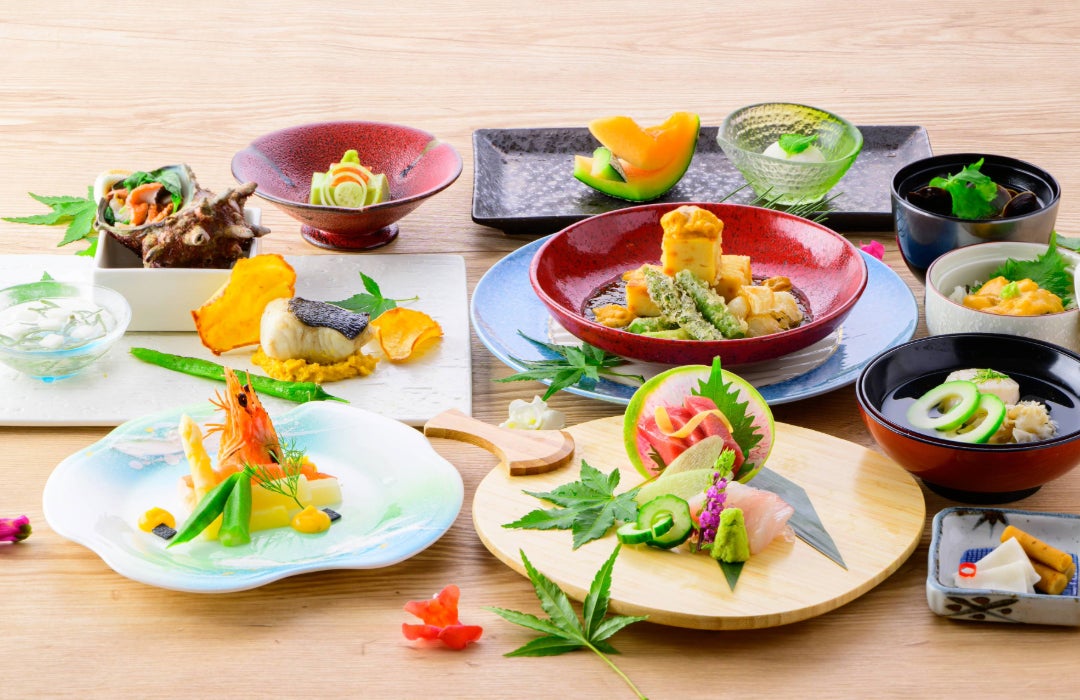 雲丹や栄螺、ホワイトアスパラ、メロンなど季節の味覚を丁寧に仕立て、一椀一皿に四季の美と技を込めました。和の贅を心ゆくまでご堪能ください。