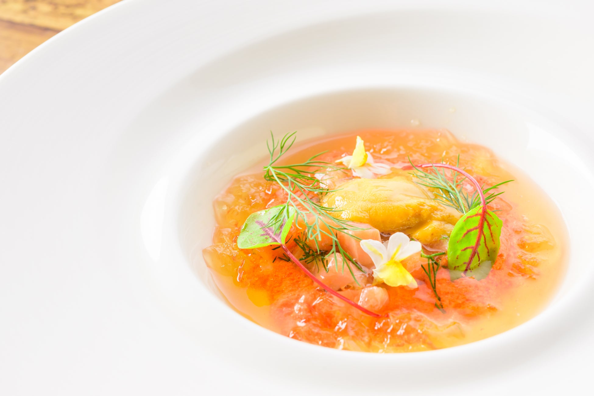 雲丹はその豊かな甘みと旨味で口の中に余韻を残し、ニジマスはタルタルに仕立てることでその繊細な食感と清涼感を活かしました。赤ピーマン、ハーブの香りが加わり、魚介の持つ個性をより際立たせています。