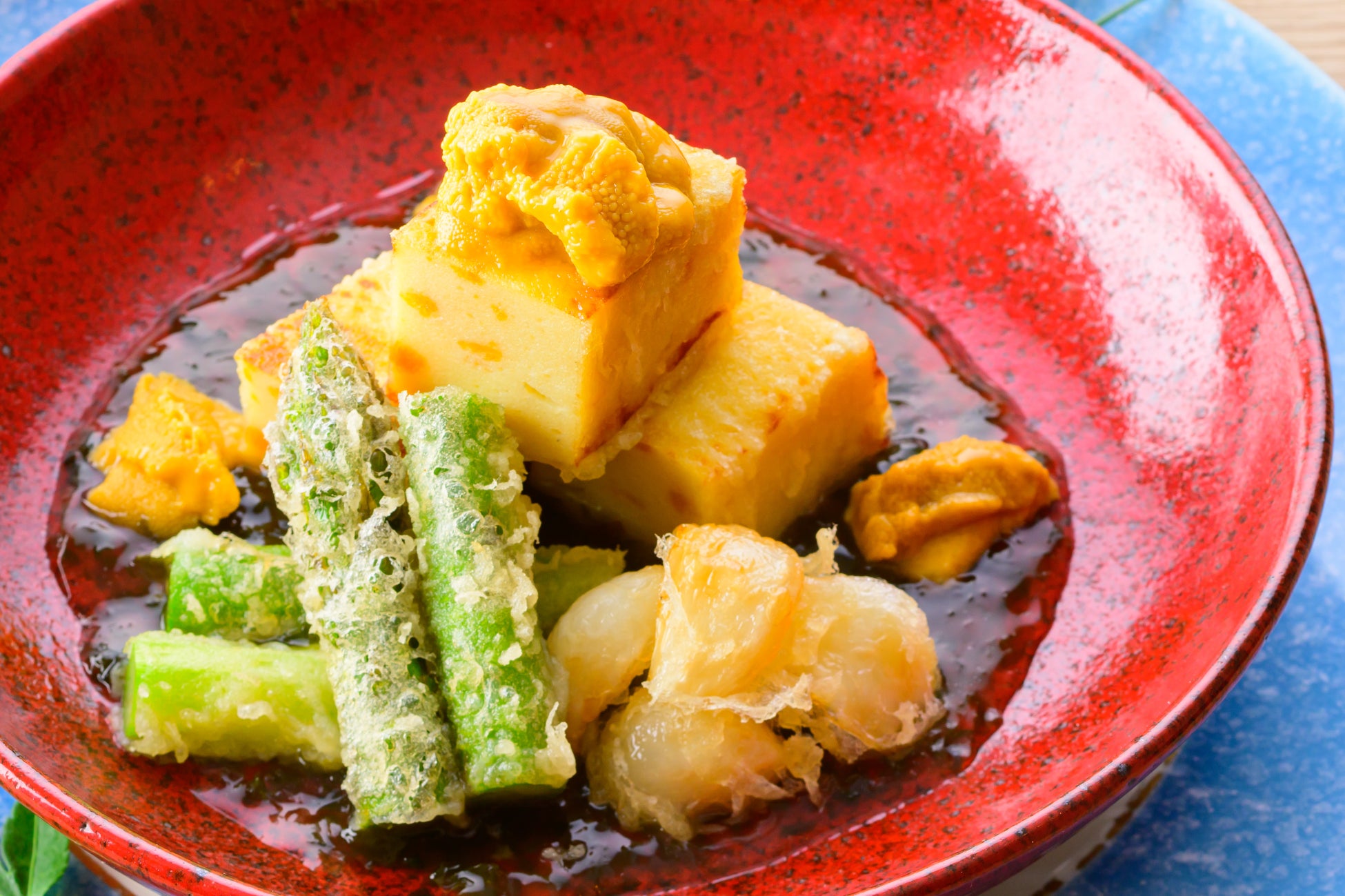 ◇進肴 有精卵の雲丹入り厚焼き卵揚げ出し 生雲丹添え 磯香庵 有機グリーンアスパラ 百合根
