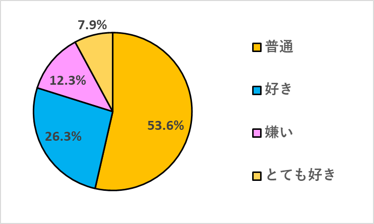 「洗濯は好きですか?」の質問に対し、最も多かった回答は「普通」で53.6%、次いで「好き」が26.3%、「嫌い」が12.3%という順になりました。好きでも嫌いでもないという人が半数以上なのですね。