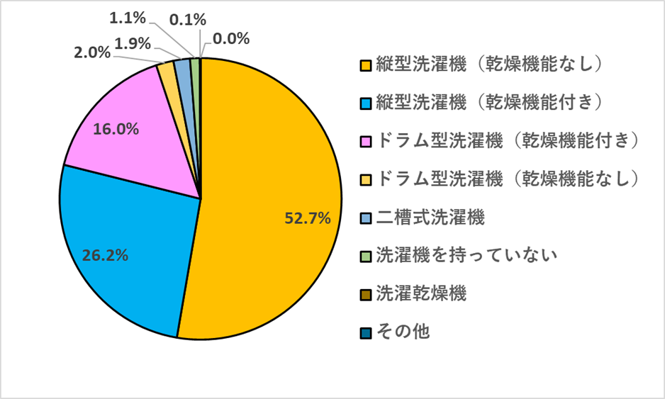 「家でどの種類の洗濯機を使っていますか?」の質問に対し、「縦型洗濯機(乾燥機能なし)」が52.7%、「縦型洗濯機(乾燥機能付き)」が26.2%、「ドラム型洗濯機(乾燥機付き)」16.0%の順になりました。縦型洗濯機を使っている方が多いようですね。