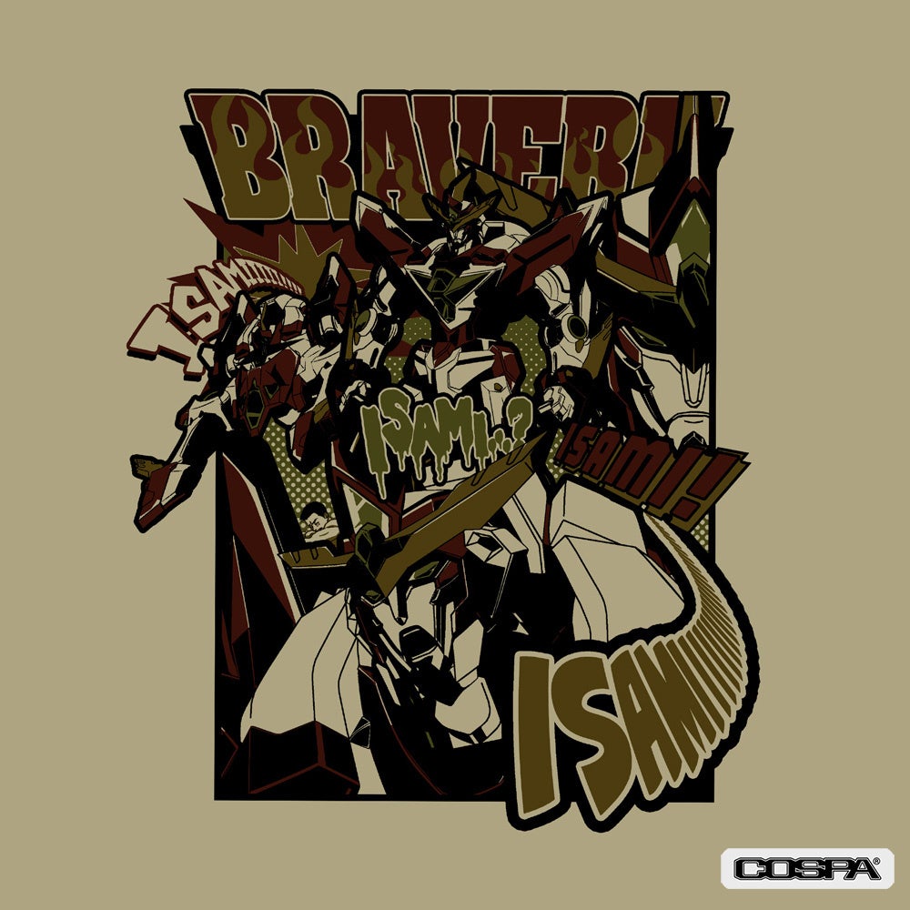 コスパより、大張正己デザインによる人型ロボット「ブレイバーン」の姿をデザインしたブレイバーンTシャツに、自衛隊所属パイロット「イサミ・アオ」を呼ぶブレイバーンの「イサミィーーッ!」の声が今にも聞こえてきそうなイサミィーーッ!Tシャツの2種が登場。