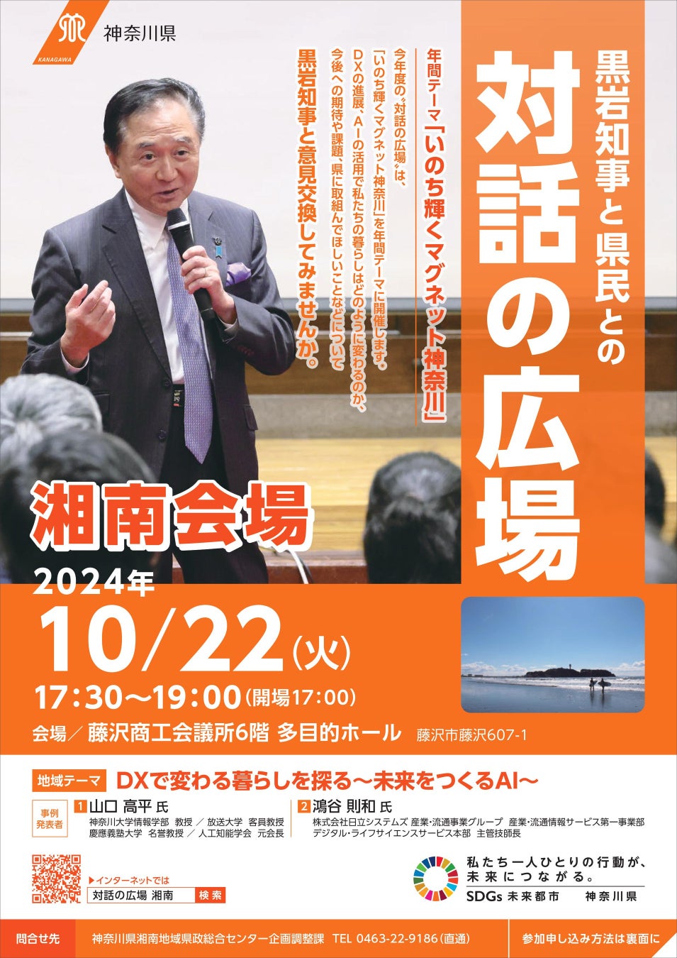 令和6年10月22日(火曜日)17時30分から、藤沢商工会議所で、「DXで変わる暮らしを探る~未来をつくるAI~」をテーマに、黒岩知事と県民との“対話の広場”【湘南会場】を開催します。