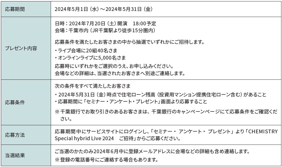 Chiba Bank × Sony Bank 「CHEMISTRY Special hybrid Live 2024」ご招待キャンペーン実施のお知らせ