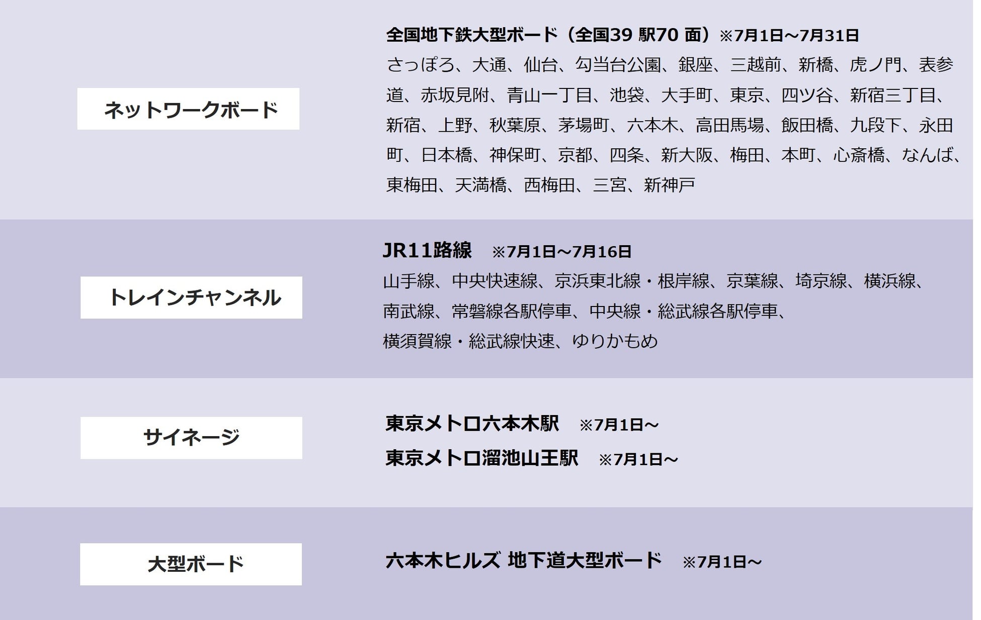 全国主要駅のネットワークボードを中心に、40駅以上で交通広告を展開。その他、JRトレインチャンネルでもCM映像を放映いたします。札幌、仙台、大阪、京都、神戸など、関東圏以外の広告出稿は初となります。