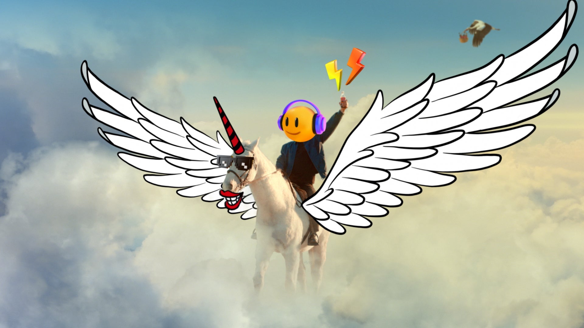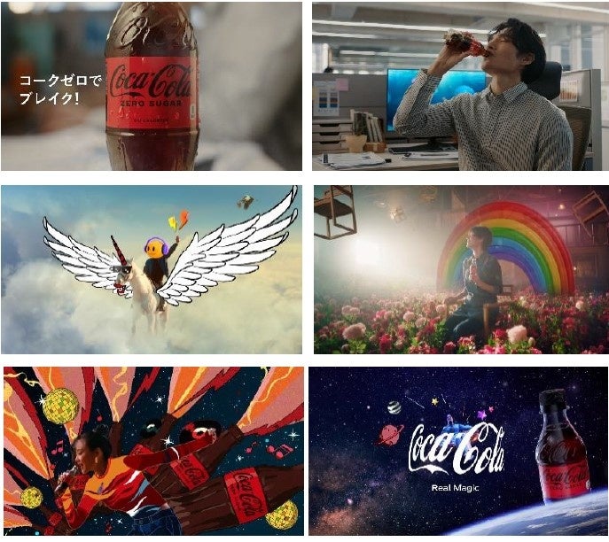 バイクに乗り、踏切が開くのを待つ男性が「コカ・コーラ ゼロ」を一口飲むと、世界が一変。男性の乗っているバイクが白馬へと変わり、男性の顔はにっこりした絵文字へ変わる。白馬には翼と角、サングラスなどが描き足され、ユニコーンになる。