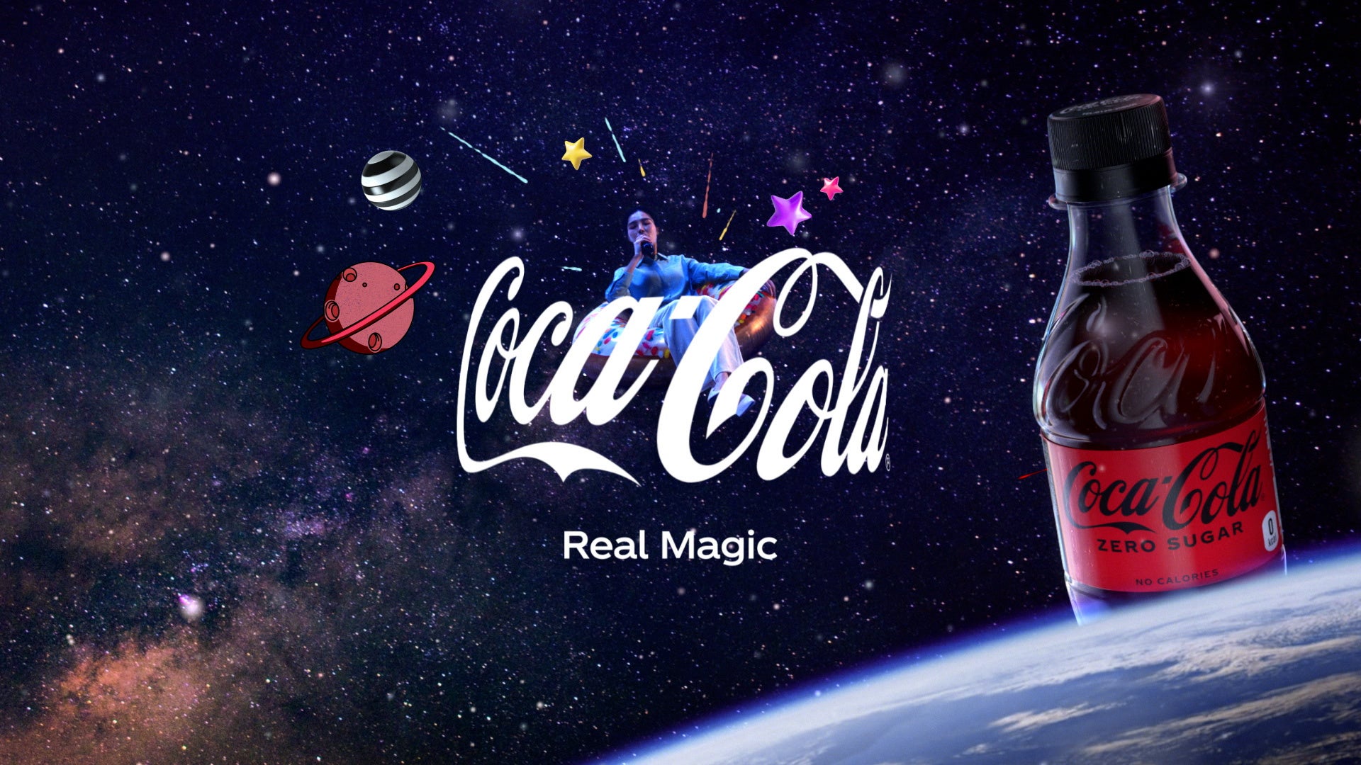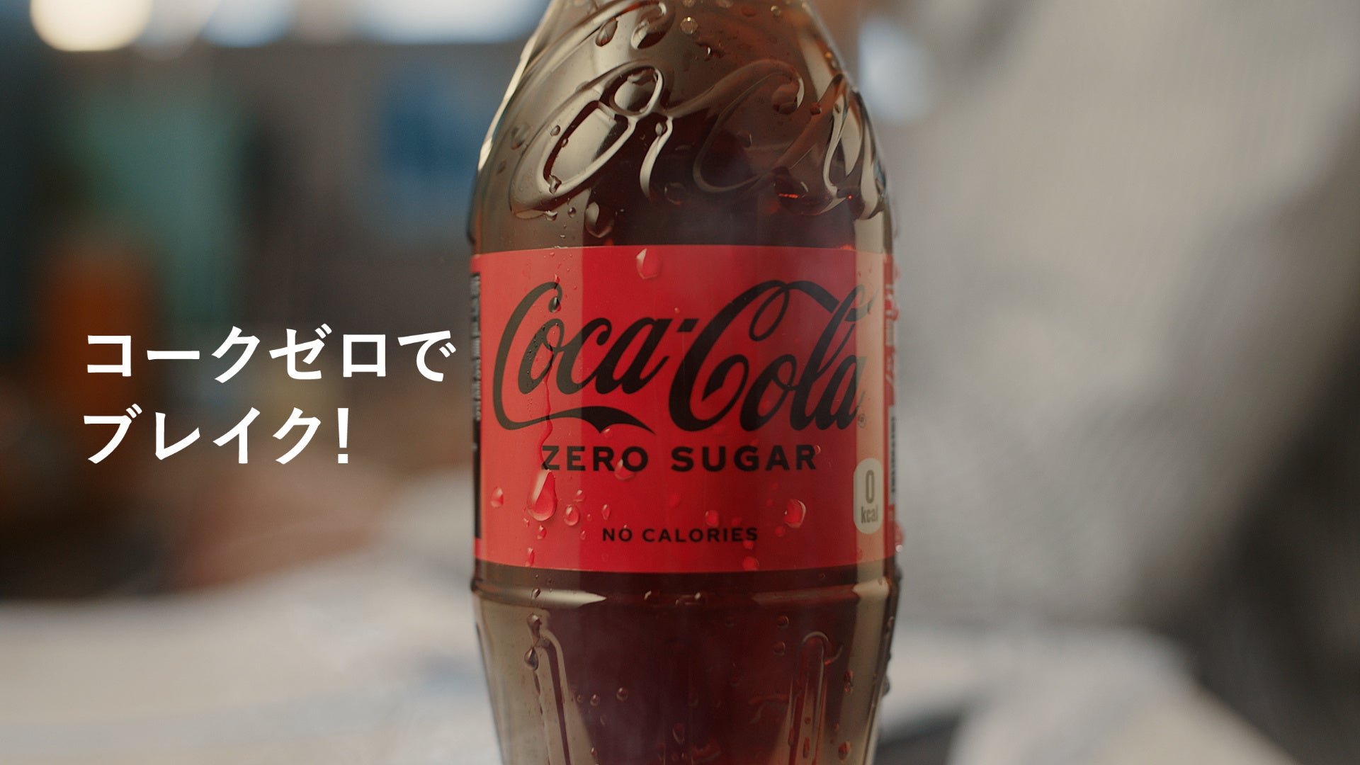「コカ・コーラ」の炭酸がはじけるシーンから徐々にズームアウトしていき、テーブルの上に「コカ・コーラ ゼロ」のボトル。