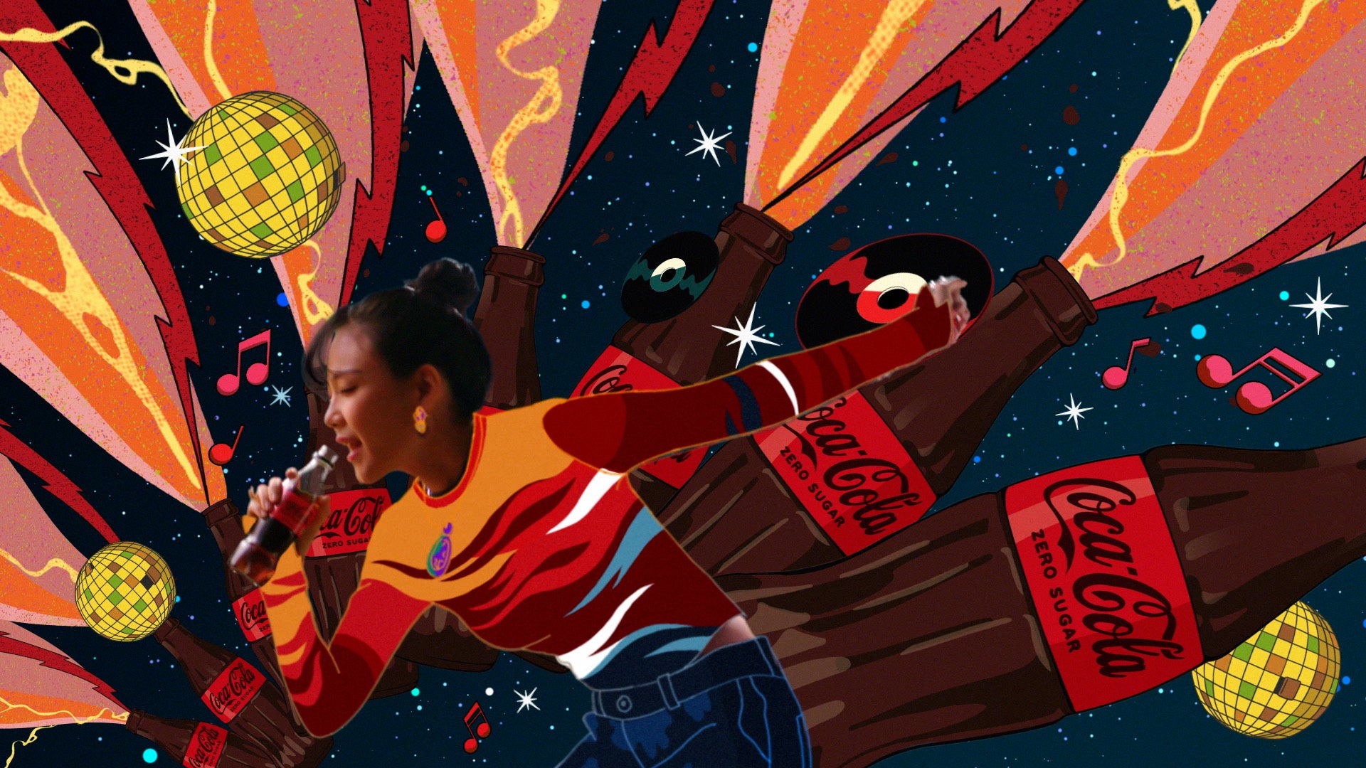 スタジオにいる女性が置いてある「コカ・コーラ ゼロ」を眺めると、そのボトルにビリビリとしたエフェクトが描き足される。一口飲むと、女性の体の周りにもビリビリとしたエフェクトが描き足され、背景が「コカ・コーラ ゼロ」やミラーボール、レコードなどが賑やかに描かれた世界へと変わり、女性はノリノリで歌い出す。