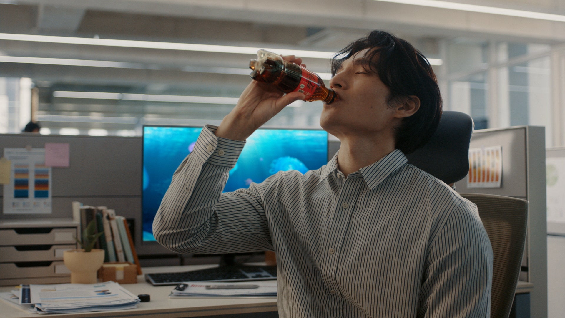 仕事でお疲れ模様の男性サラリーマンが「コカ・コーラ ゼロ」を眺め、一口飲む。すると、近くのパソコン画面に映っている海中の世界へ、まわりが一変する。海中ではマスクと酸素ボンベ、フィンや泡が手書きで描き足され、男性がまわりのクラゲや亀に驚く。