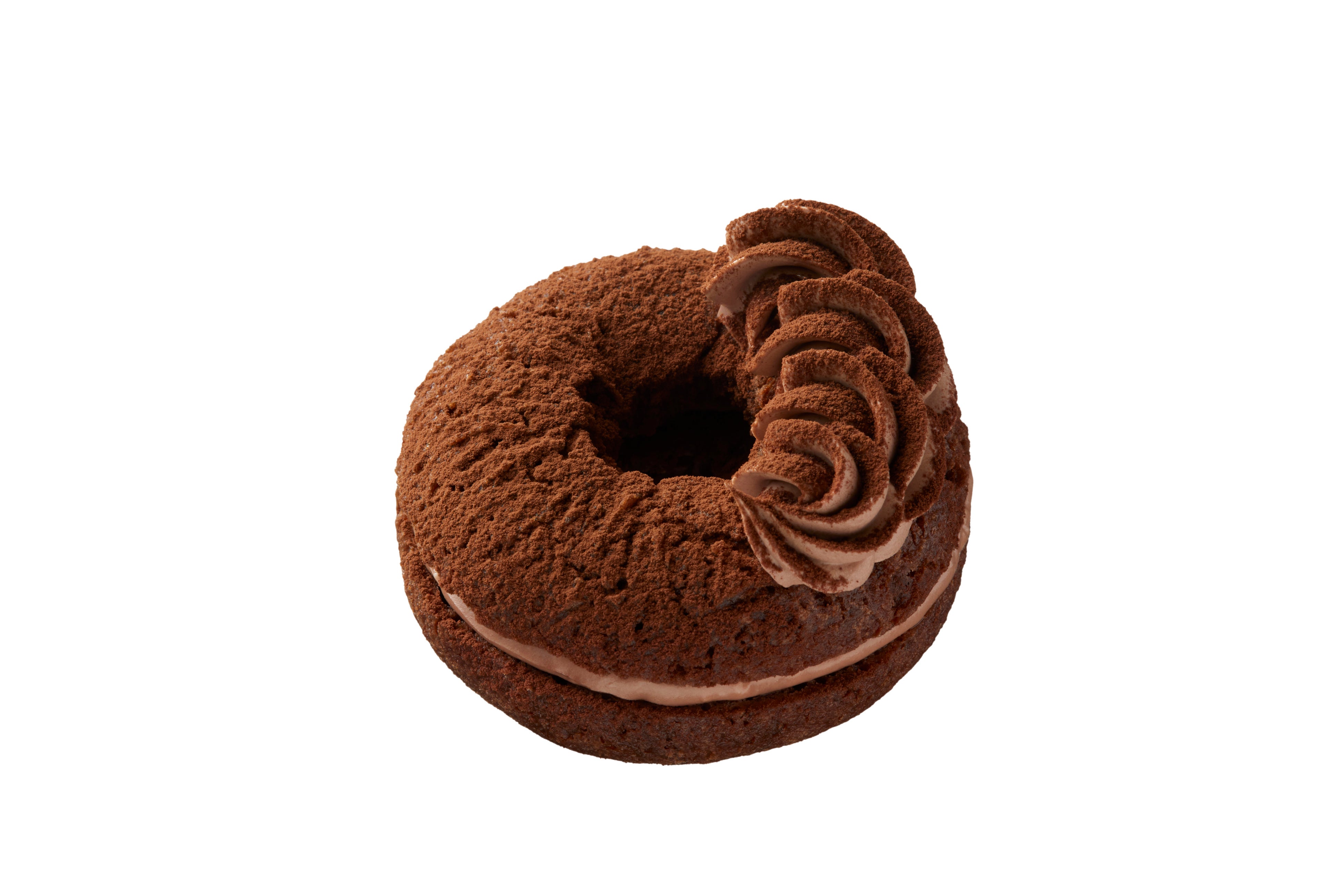 ドーナツショコラ生地にグラハム入りヘーゼルナッツクリームとガナッシュホイップをサンド。ガナッシュホイップを絞りココアパウダーをふりかけて、ケーキ「ショコラ ノワゼット」をイメージしました。
