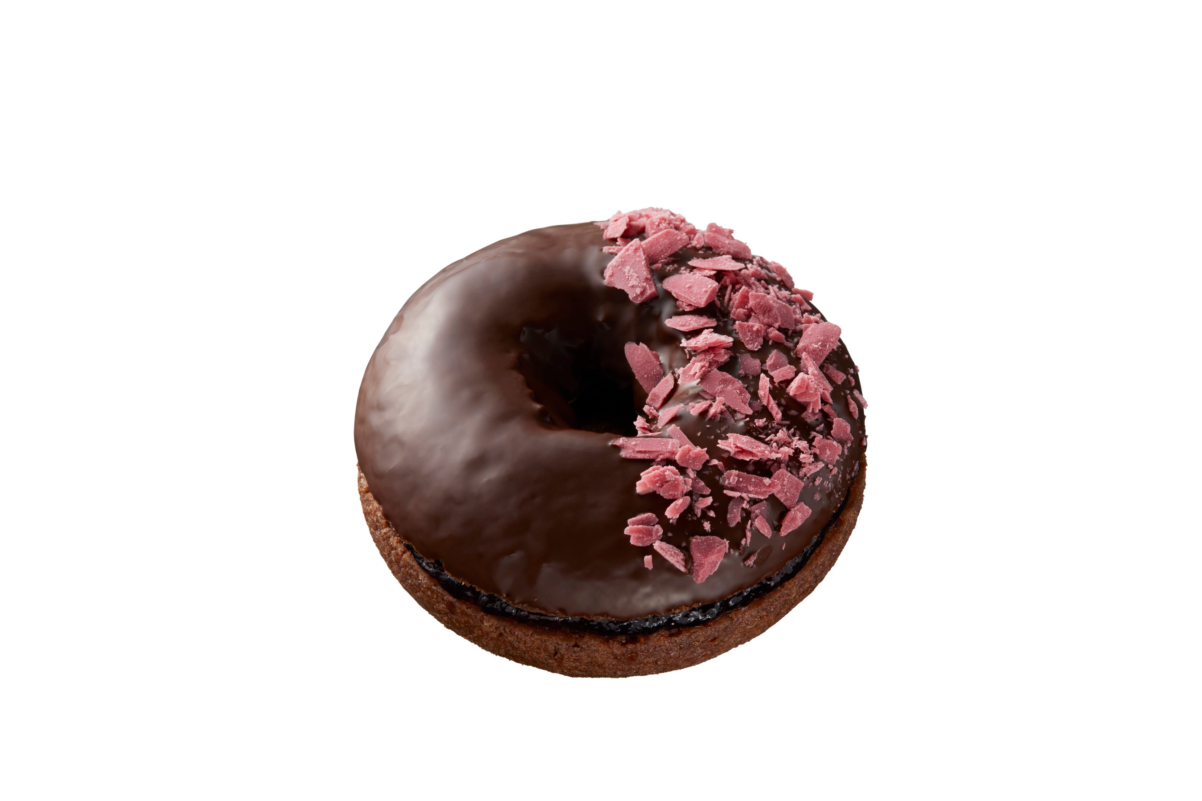 ドーナツショコラ生地にブルーベリージャムとガナッシュクリームをサンド。チョコレートでコーティングし、フランボワーズ風味のフレークチョコで飾り、プラリネショコラ「ミルティーユ」をイメージしました。