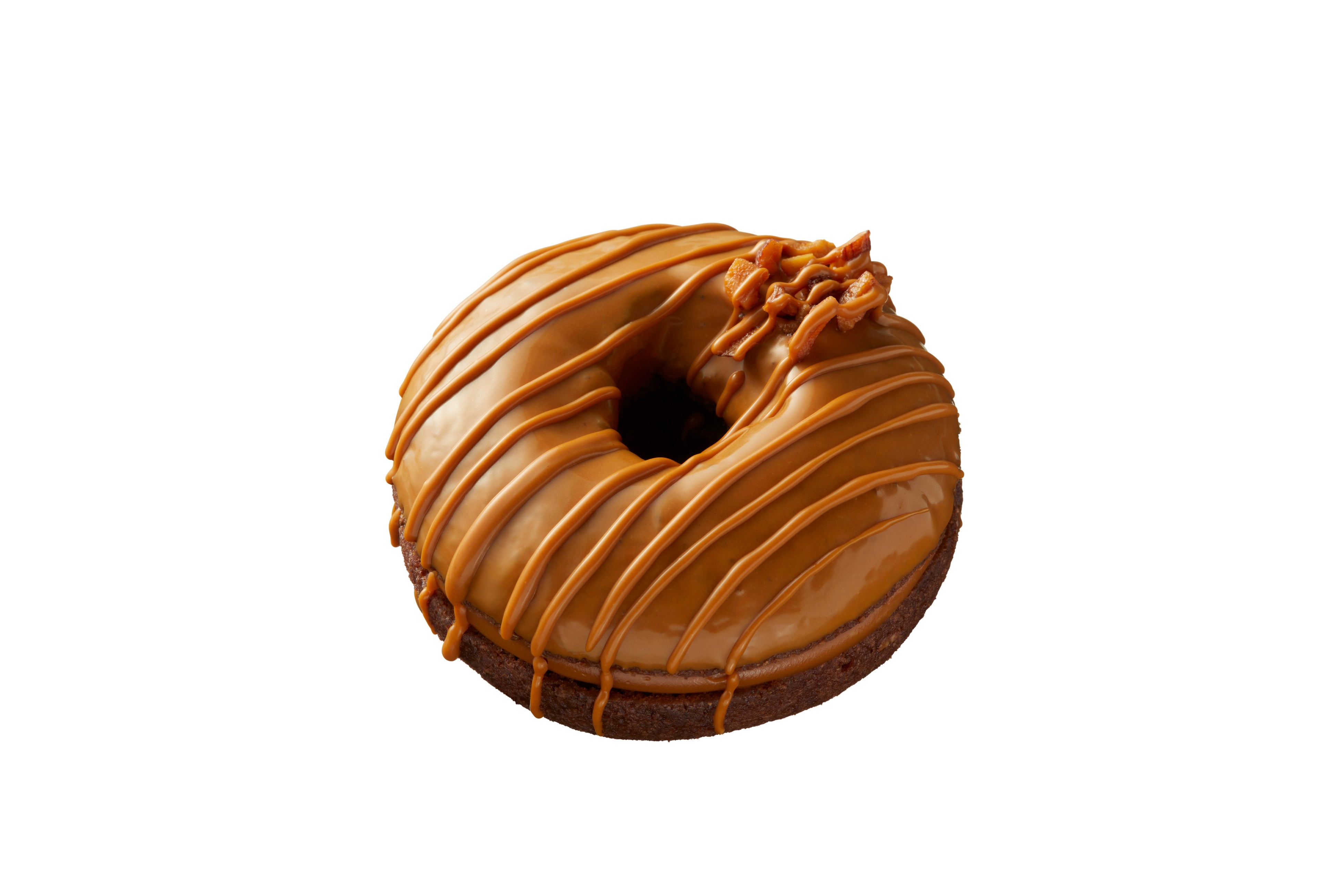 ドーナツショコラ生地にキャラメルモカクリームとガナッシュクリームをサンド。キャラメルチョコでコーティングして線を描き、ポイントにナッツをトッピング。プラリネショコラ「マロー」をイメージしました。