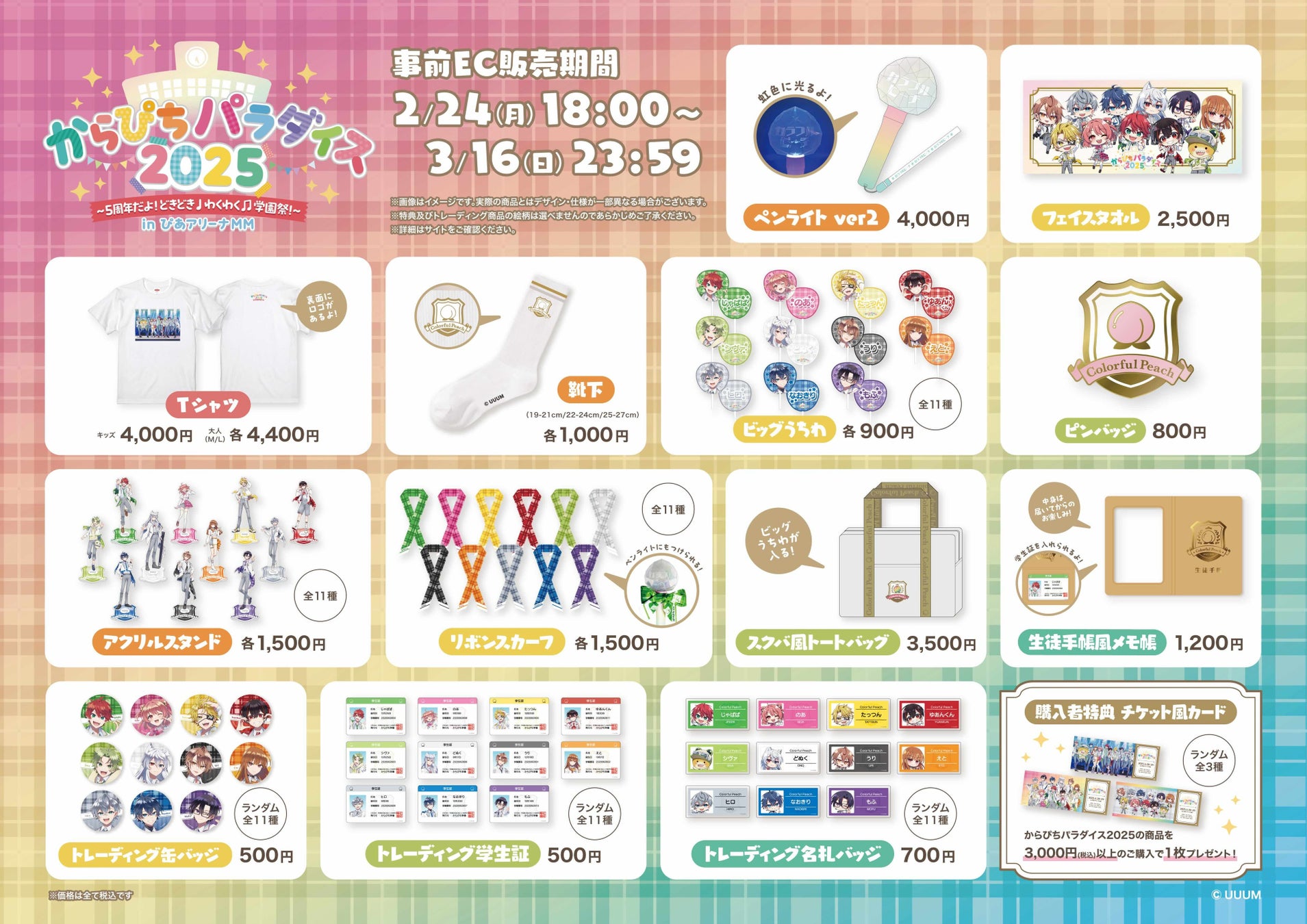 UUUM株式会社(本社:東京都港区、代表取締役 社長執行役員:梅景 匡之、以下、UUUM)は、2025年6月28日、29日に開催するカラフルピーチによる単独イベント「からぴちパラダイス2025 〜5周年だよ!どきどき♩わくわく♫学園祭!〜inぴあアリーナMM」のチケット1次先行受付を明日2月15日から開始します。チケット受付にあわせて、グッズ情報、e プリントサービス情報を本日公開しましたのでお知らせします。