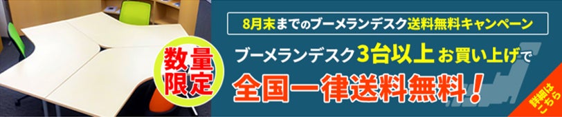そこで、ブーメランデスクをより多くの方にお届けするために、3台以上お申込みのお客様を対象に配送料を弊社負担とするキャンペーンを実施いたします。オフィス移転やレイアウト変更をご検討中の企業様、この機会にぜひご利用ください。