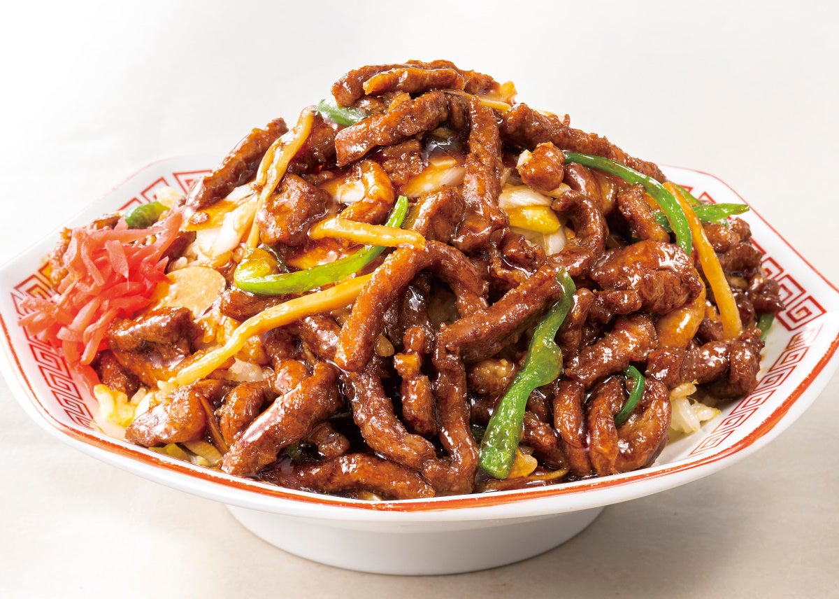 しっかりと味付けされた細切りの豚肉に筍・ピーマンを加え、あっさりと仕上げた餡かけを、薄味のガーリック炒飯にあわせました。たっぷりの餡、旨味溢れる肉、香ばしい炒飯が渾然一体となり、くせになる一品です。さらにガッツリと楽しみたい方向けに、肉・炒飯ともに2倍に増量する「肉だく」もご提供いたします。