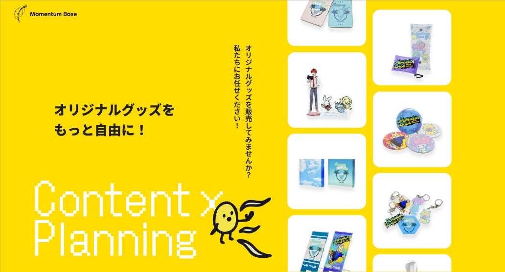 当ブースでは、オリジナルグッズ・ノベルティアイテムの展示を行い、オリジナルグッズ・ノベルティ制作のOEM事業「MomentumBase」を中心に、推し活を幅広くサポート可能な弊社の事業についてご案内いたします。
